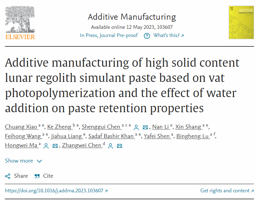 2023年5月12日,sunbet官网3D打印与智能制造研究中心粤莞联合基金粤港澳研究团队项目(适应太空环境的月壤材料3D打印基础研究)课题组在Additive Manufacturing期刊(增材制造期刊,中科院JCR大类一区,IF=11.632)发表了最新的模拟月壤光固化3D打印成果:Additive manufacturing of high solid content lunar regolith simulant paste based on vat photopolymerization and the effect of water addition on paste retention proper...