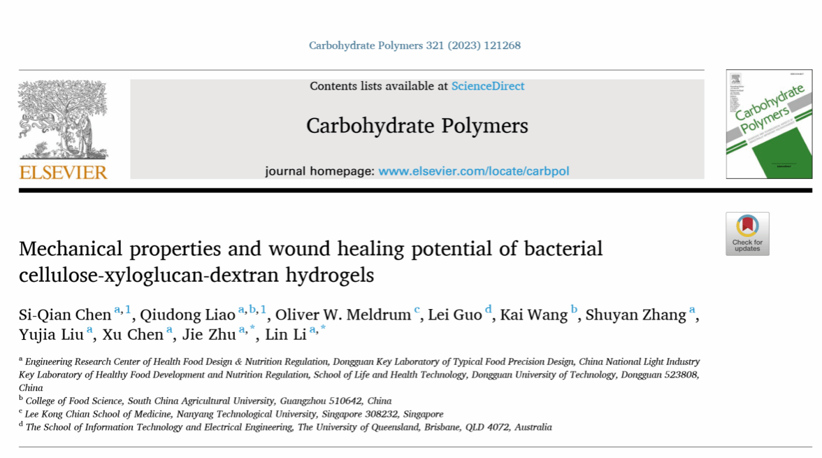 2023年8月,东莞理工学院生命健康技术学院、东莞理工科技创新研究院食品营养健康工程与智能化加工研究中心陈思谦副教授在《Carbohydrate Polymers》(IF: 11.2, 一区top刊物)发表了题为“Mechanical properties and wound healing potential of bacterial cellulose-xyloglucan-dextran hydrogels”的研究论文。硕士研究生廖秋冬为共同第一作者,朱杰教授、李琳教授为通讯作者。细菌纤维素(bacterial cellulose,BC)是一类由...