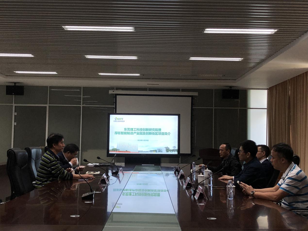 会议上科创院院长周梓荣、副院长夏能礼接待了来宾,周梓荣院长对厚街资产经营管理有限公司的来访表示热烈的欢迎,并向厚街资产经营管理有限公司介绍了东莞理工学院近年来的发展成果及政府对东莞理工的大力支持,并向客人介绍了研究院在技术创新、成果转化、服务地方经济发展等方面的规划,夏能礼副院长为来宾介绍了研究院的概况、科技创新模式,智能制造产业园及创新街区项目。