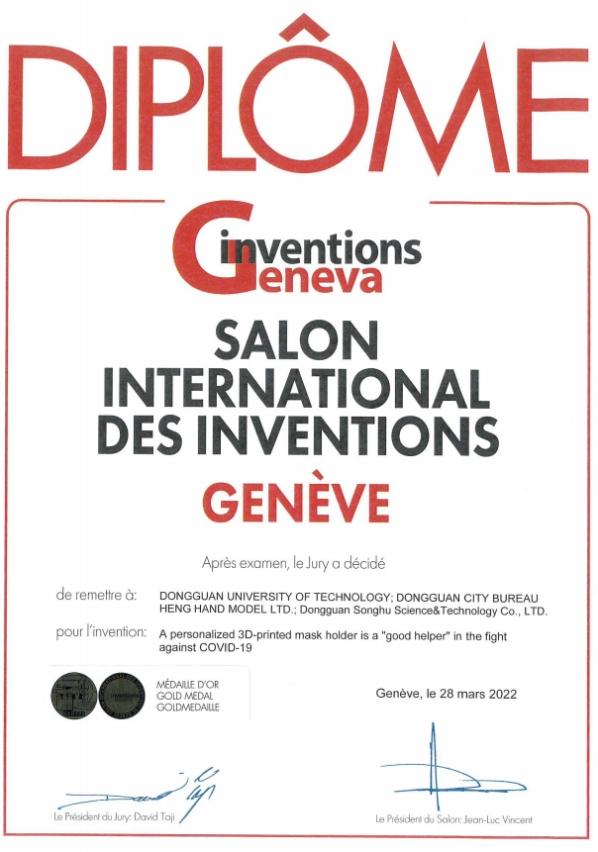 2022年3月16日至20日,第49届日内瓦国际发明展(International Exhibition of Inventions of Geneva)通过线上方式举办。机械工程学院陈盛贵高工、科技创新研究院周梓荣教授、教育学院(师范学院)李楠副教授等联合东莞市科恒手板模型有限公司、东莞市松湖科技有限公司完成的《抗击新冠疫情的“好帮手”——一种个性化3D打印口罩支架》项目获得金奖。