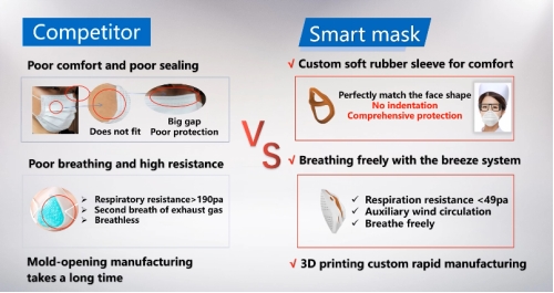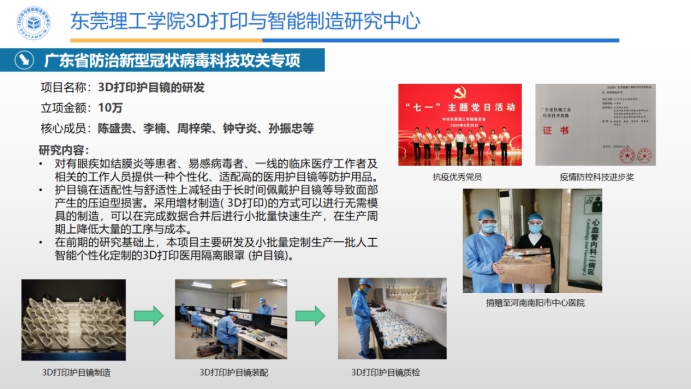 “科技战疫、快速制造,智能防护用品专属定制”:2020年疫情期间,新型冠状疫情的蔓延,导致全球的医疗防护用品紧缺。通过新闻媒体的报道,我们可以看到医护人员长久佩戴防护用品过后会出现的皮肤压痕、镜片起雾等情况;由于传统模具制造中冷却系统的异形水路技术未在中小企业中进行技术改革,导致防疫物资产量不足。根据调查,防护用品普遍具有舒适性差、贴合度低、安全性弱、雾化严重、呼吸不畅、制造缓慢等痛点,因此设计一款能快速制造、并具备个性化定制的防护用品对于一些需要特殊保护的行业人员显得尤为重要。东莞理工学院3D打印与智能制造研究中心快速组建应急研发小组,运用自身的条件和优势,在短期时间内成功研发制作了3D打印应急防疫物资,截至2020年3月2日,团队累计生产的3000套3D打印应急全封闭防疫物资并捐赠至防疫一线,为医护人员的安全保驾护航。