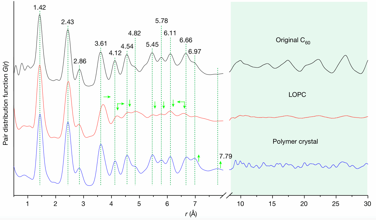 图1富勒烯C60分子晶体、LOPC晶体和聚合物晶体的中子PDF结构表征