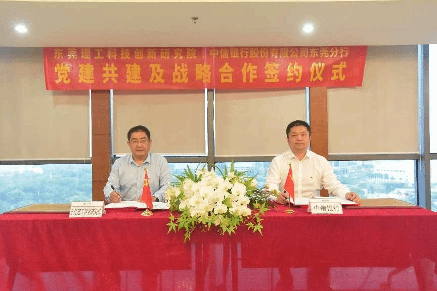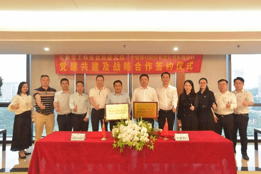 致辞后,在全体参会人员的见证下由中信银行东莞分行党委委员、副行长程瑞以及东莞理工科技创新研究院院长夏能礼作为签约双方代表,签订了内容涵盖党建共建协议及战略合作协议,并交换战略合作牌匾。