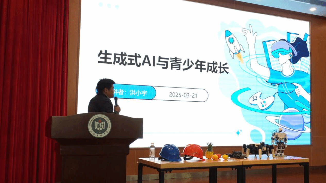在活动的第二阶段,同样来自东莞理工学院计算机科学与技术学院的洪小宇老师,从生成式AI这一切入点出发,用贴近生活的讲解方式,向同学们介绍了生成式AI已逐渐融入生活的方方面面,以及其对初中生学习和成长产生的重要影响。