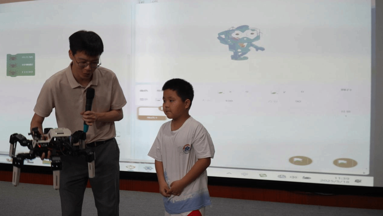 活动的第三阶段,魏小锐老师通过互动的方式,让同学们亲身体验了人工智能的原理及应用。现场运行代码进行动态人脸特征捕捉,让大家了解到人脸识别的原理;手指关节的实时检测,让同学们了解手势识别的原理,将体感游戏背后的原理进行可视化。人体关节与动画人物的实时映射,让同学们了解动画创作背后的AI应用。同学们通过自主拖动图形化代码,让人形机器人仰卧起坐,六足仿生机器人扭动着身躯,做着各种高难度动作。