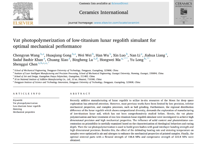 本研究以《Vat photopolymerization of low-titanium lunar regolith simulant for optimal mechanical performance》为题发表在SCI收录期刊《Ceramics International》(IF2021=5.532,JCR Q1区)。该论文是开展光固化3D打印低钛模拟月壤的研究性文章,硕士研究生王成运(广西大学机械工程学院,联合培养)为本文第一作者,东莞理工学院粤港研究团队项目课题组马宏伟教授、陈盛贵高级工程师和广西大学龙雨教授为本文通讯作者,卢秉恒院士为本文提供指导并署名。
