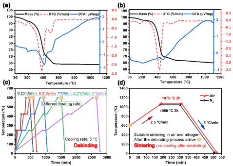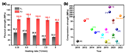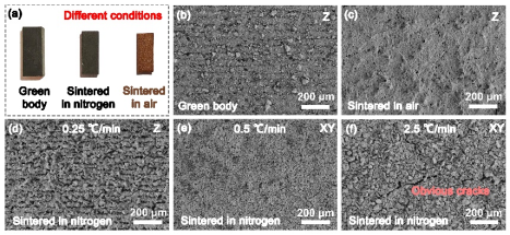 近期,深空探测的开展使利用月球原位资源进行增材制造的策略受到关注。然而,以往大多数工作都受到精度低、机械性能差和制造流程复杂的限制。此外,不同区域的月壤具有一定成分差异,低钛月壤的制造方案仍未得到充分研究。本文从低钛型模拟月壤的光固化3D打印和热处理策略的角度出发,探究并实现高尺寸精度和高机械性能的样件制造。具体来说,本文基于流变特性测试和固化深度表征,深入研究了固含量和光引发剂浓度对可打印性的影响。随后,通过进一步工艺优化,研究人员成功利用光固化3D打印技术制造出了层间结合强度好、尺寸精度高的坯体。此外,本研究还在空气和氮气两种保护气氛中研究了脱脂升温速率和烧结温度对样品的影响,以提高样品的力学性能。最终,获得了弯曲强度为108.8 MPa、抗压强度为222.8 MPa的烧结件,这充分展现了该技术应用于未来太空制造的潜力。