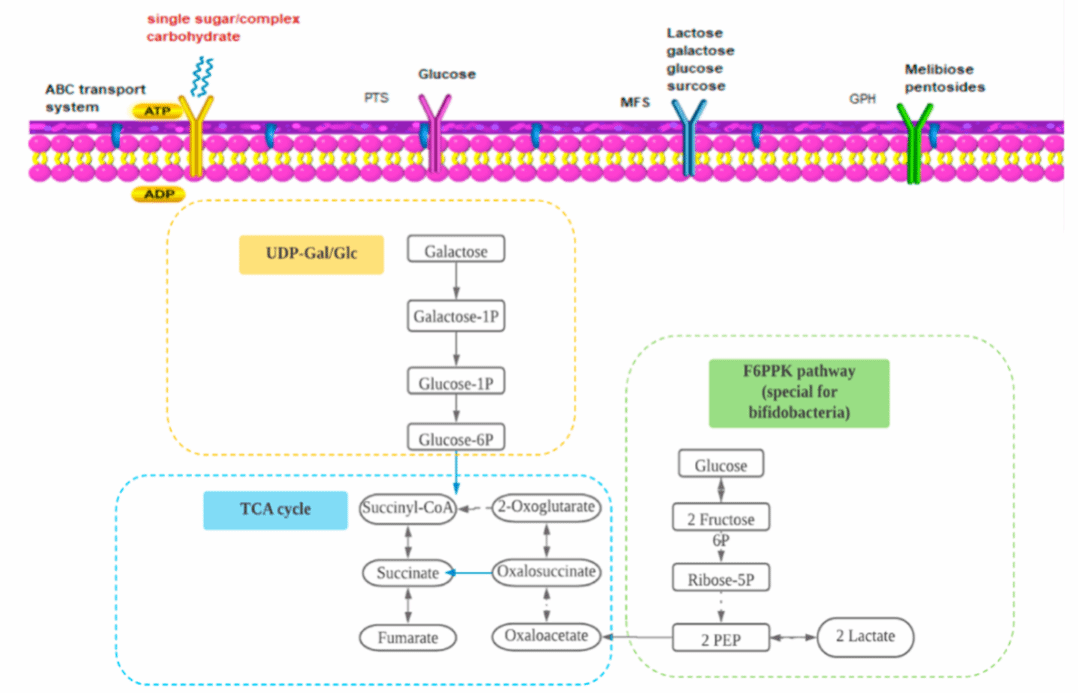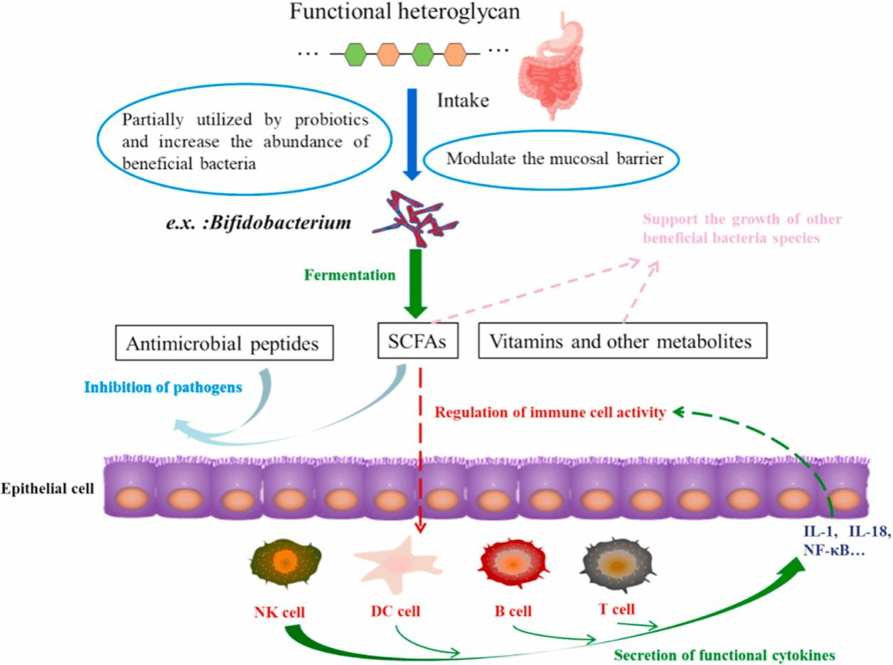 摄入杂多糖能促进双歧杆菌定植,重塑人体肠道菌群。杂多糖不能被人类基因组中编码的酶完全降解,大多数的杂多糖到达大肠中被肠道微生物降解。双歧杆菌属是在人类胃肠道中关键肠道微生物之一,能代谢各种结构复杂的多糖,包括:阿拉伯木聚糖、魔芋葡甘聚糖、n-聚糖、果胶、O-GalNAc聚糖等杂多糖,能够生成短链脂肪酸(SCFAs)、乳酸等代谢产物,有助于双歧杆菌属的定植、调节肠道菌群、增强人体免疫力、减少过敏反应等。然而,双歧杆菌对杂多糖的代谢途径、肠道菌群调节机制和人体健康调节作用尚未明确。