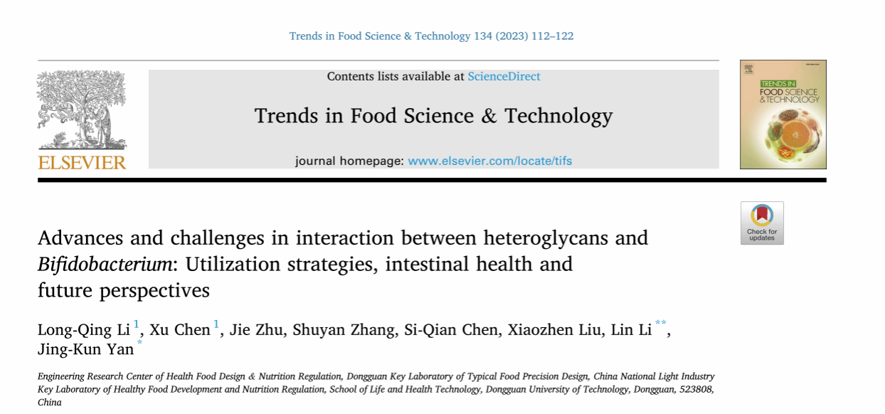 2023年2月27日,sunbet官网生命健康技术学院、食品营养健康工程与智能化加工研究中心在国际食品顶级期刊《Trends in Food Science & Technology》(Q1,IF=16.002)在线发表题为“Advances and challenges in interaction between heteroglycans and Bifidobacterium: Utilization strategies, intestinal health and future perspectives”的综述论文。论文的第一作者为李垄清副研究员,通讯作者为东莞理工学院生命健康技术学院、食品营养健康工程与智能化加工研究中心李琳教授和闫景坤教授。