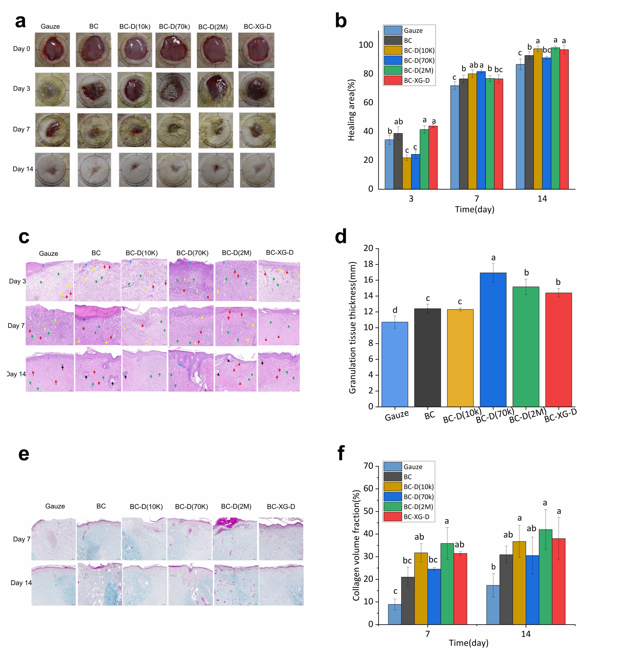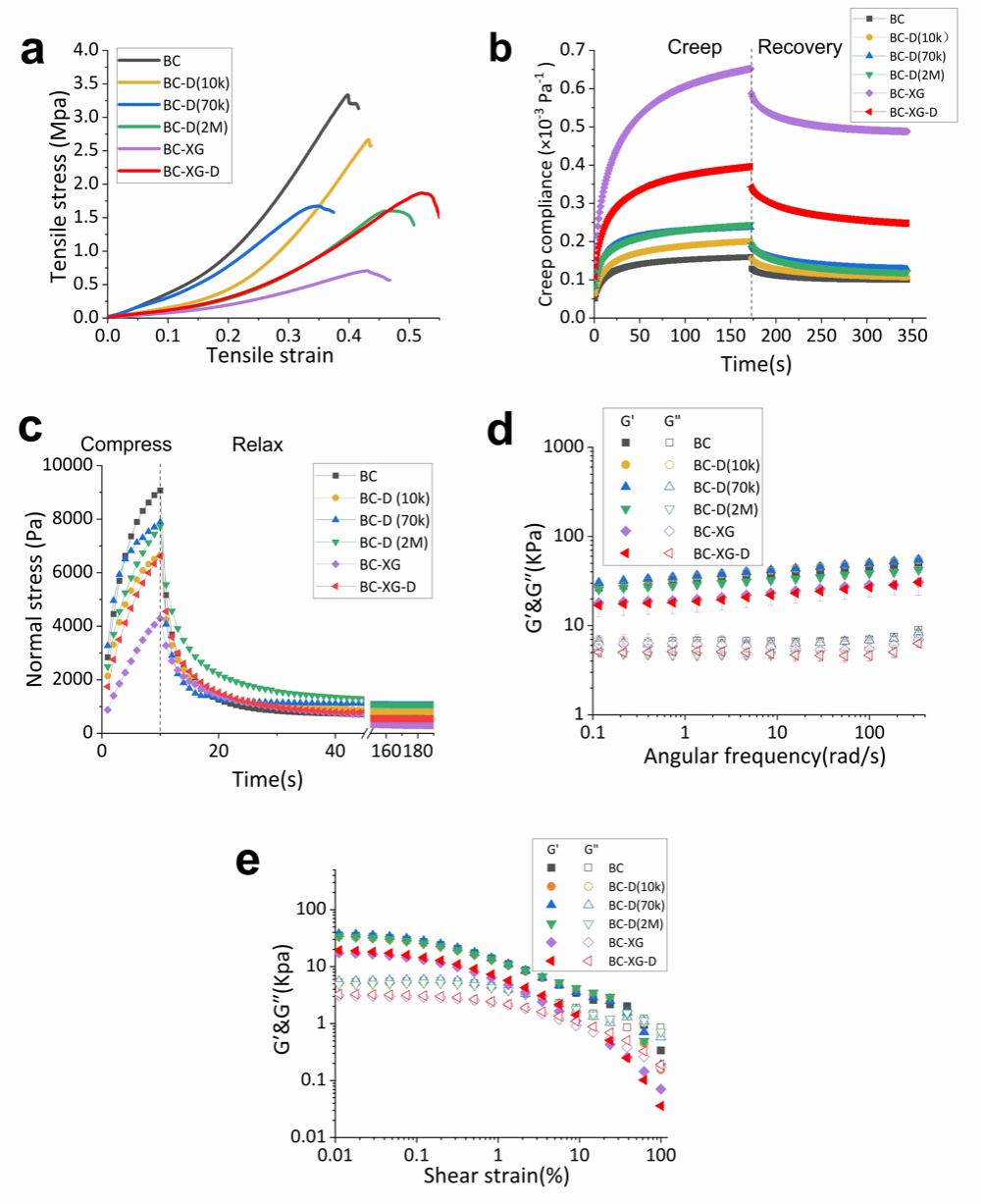 细菌纤维素(bacterial cellulose,BC)是一类由细菌合成的纳米级生物多糖材料,具有很好的生物相容性和优良的力学性能,常被应用于人造血管、皮肤等医用材料。但天然细菌纤维素水凝胶的延展性能较低,同时促伤口愈合能力有限。本研究受植物细胞壁纤维素网络延展性能受木葡聚糖(Xyloglucan,XG)半纤维素调控这一机制的启发,通过原位合成法使BC-XG复合,并引入右旋糖酐(Dextran)增强促伤口愈合能力,制备了一种细菌纤维素-木葡聚糖-右旋糖酐(BC-XG-D)水凝胶,使其延展性能增加了近40%,并显著(p<0.05)增加了促伤口愈合能力。