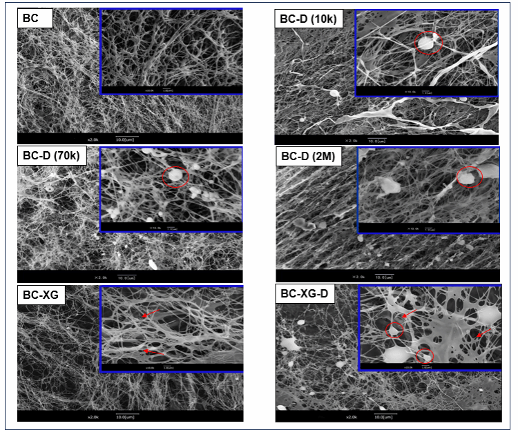 图2 2000倍电子显微镜下细菌纤维素-木葡聚糖-右旋糖酐复合水凝胶(BC-XG-D,D为2M分子量)微观结构与原细菌纤维素(BC)、细菌纤维素-右旋糖酐凝胶(BC-D括号里代表右旋糖酐分子量)及细菌纤维素-木葡聚糖水凝胶(BC-XG)结构对比