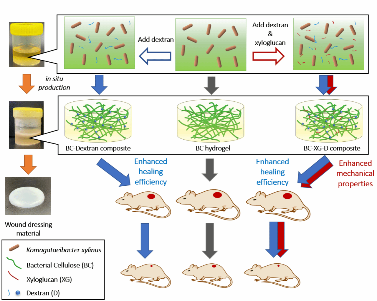 图1细菌纤维素-木葡聚糖-右旋糖酐复合水凝胶伤口敷料制备方法及效果概念图
